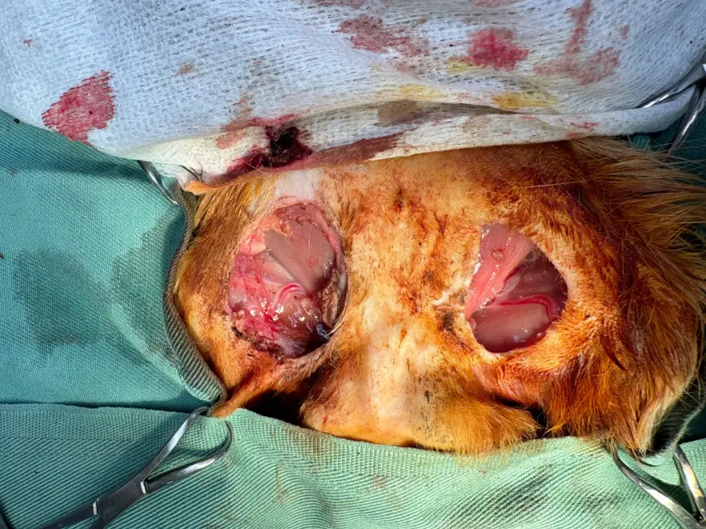 モルモットは両側に一対の乳腺があるのですが、この症例は右側の乳腺が腫瘍化し、表面から出血を起こしていました。また左側の乳腺は出血はないですが、腫瘍化していました。